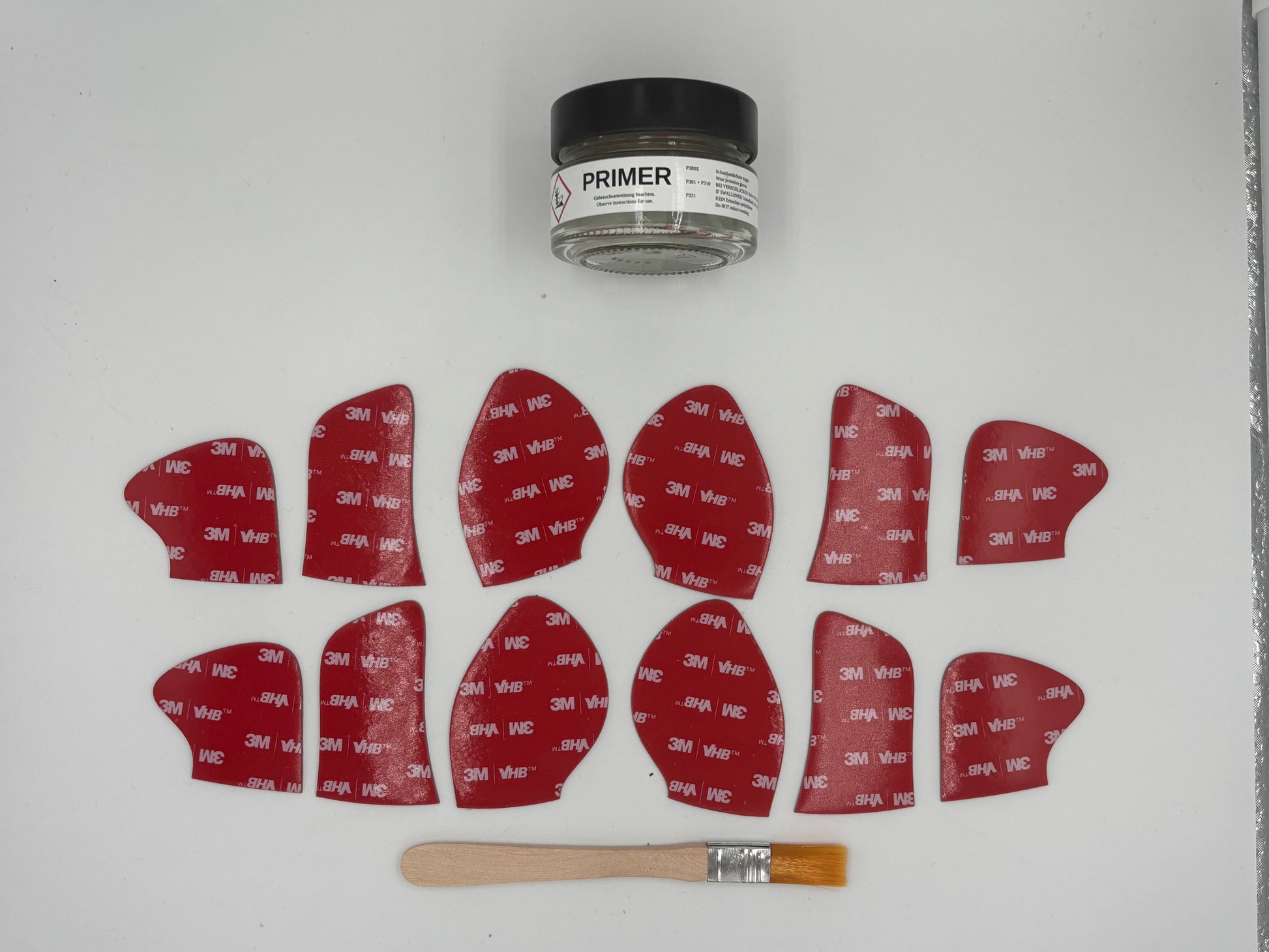 Zum Nachkleben Ihrer Beschläge bieten wir Ihnen ein praktisches Set bestehend aus 12 Laschen, einer Dose Primer und einem Pinsel an.